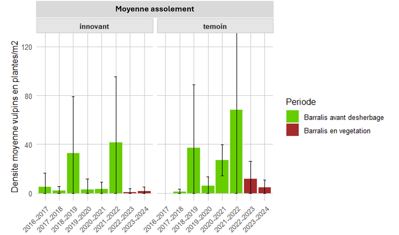 A l’inverse, la combinaison de leviers mobilisés à l’échelle du système pour maitriser les adventices se montre très efficace : rotation diversifiée et alternance de cultures d’automne, de printemps et d’été ; anticipation de la dérive du salissement par la flexibilité de positionnement des cultures de rupture comme le millet et semis direct des cultures d’automne lorsque les conditions le permettent. A ces leviers prophylactiques s’ajoutent des programmes herbicides adaptés à la parcelle. Ainsi, à l’échelle de l’assolement, les densités de vulpins sont systématiquement plus faibles dans le système innovant que dans le système témoin (cf graphique ci-dessous).