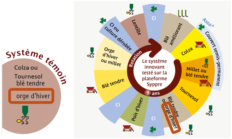 La gestion des adventices graminées de cycle hivernal – majoritairement le vulpin – est un enjeu majeur sur la plateforme Syppre Berry, comme dans la région. Le système témoin, de rotation colza – blé – orge, illustre bien les difficultés de gestion des graminées hivernales dans les rotations courtes de cultures d’hiver.