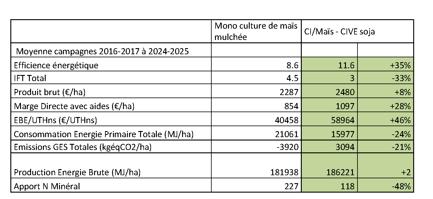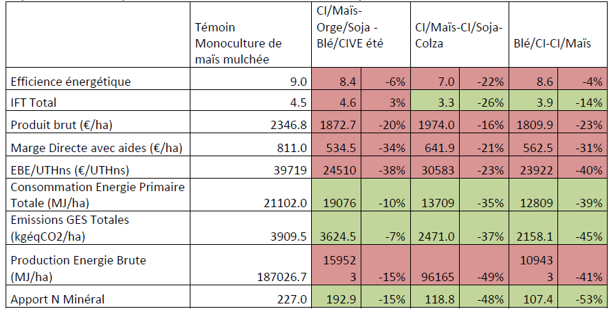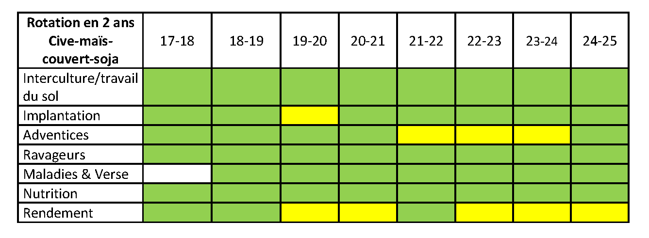 Le rendement du maïs est de 86 q/ha soit à peine moins que celui du témoin (88.9 q/ha). La Cive fait une biomasse moyenne avec 6 tMS/ha. Le soja a un rendement de 30q/ha.